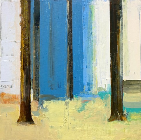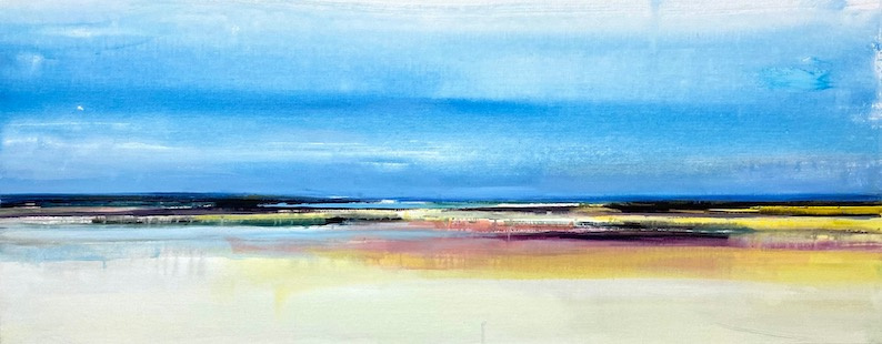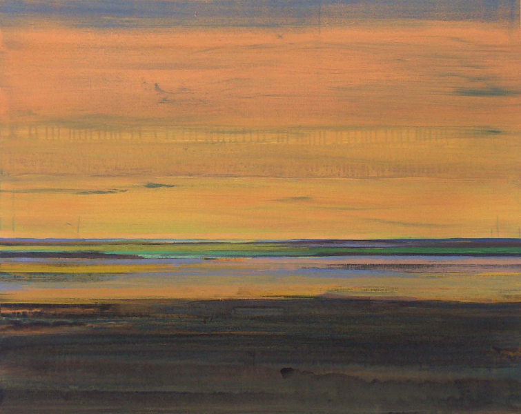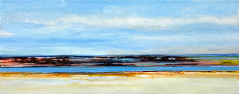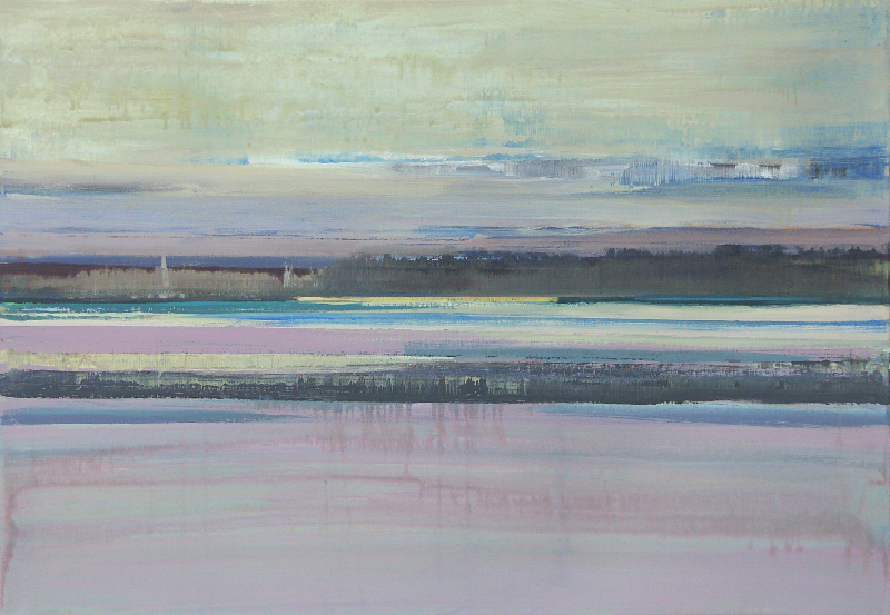 Ik schilder verstilde vergezichten in gestapelde, horizontale banen. Kleur, licht en diepte geven de landschappen, bijvoorbeeld een polderlandschap of een kustlijn, hun eigen karakter en sfeer.