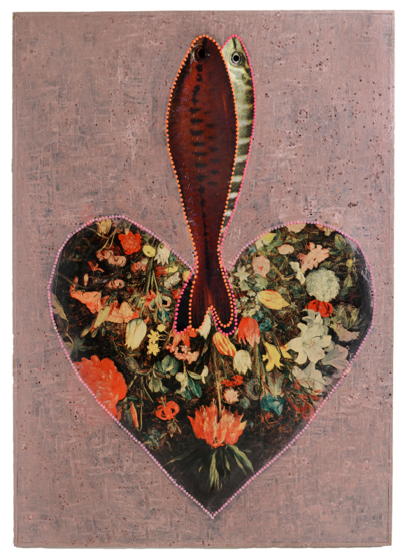 Marianne van Heeswijk maakt collages, tapijten, sculpturen en assemblages. Ze gaat daarbij uit van bestaand materiaal. Ze struint rommelmarkten af om dat materiaal te vinden. In principe kan dat alles zijn, lijkt het, maar bij nader inzien zijn er wel wat rode draden te zien. De gebruikte schilderijtjes hebben vaak religieuze thema’s , reproduceren oude meesters of verbeelden kitscherige zigeunerjongetjes. De objecten zijn vazen, schelpen, knopen, kopjes, hummelachtige beeldjes, heiligenbeelden, rijk gedecoreerde bonbondozen etc. Alles heeft een zekere glans, alles heeft iets over-de-top-perigs, alles laat het doodgewone achter zich liggen. Er is sprake van een grote culturele en materiële verscheidenheid. Vanuit die rijke en kleurrijke ‘voorraad’ gaat ze aan het werk. In de schilderijtjes vervangt ze mensenhoofden vaak door (ingenaaide) dierenkoppen, de omgeving werkt ze weg door er bijvoorbeeld een noppenpatroon van verfstipjes of een expressionistisch verflaag overheen te leggen. Het geheel omvat ze in opvallende, vaak gouden, barokke lijsten. De grote tapijten die ze de laatste jaren heeft laten maken zijn een uitvergrote, geweven versie van potentiële schilderijtjes. Inclusief lijst. De sculpturen of assemblages zijn opgebouwd uit aan elkaar gelaste of gelijmde delen van allerhande gebruiks- en sierobjecten. Niet zelden worden ze uiteindelijk opgesierd met kleine, glinsterende nep edelstenen, glimmende knopen of glitters.