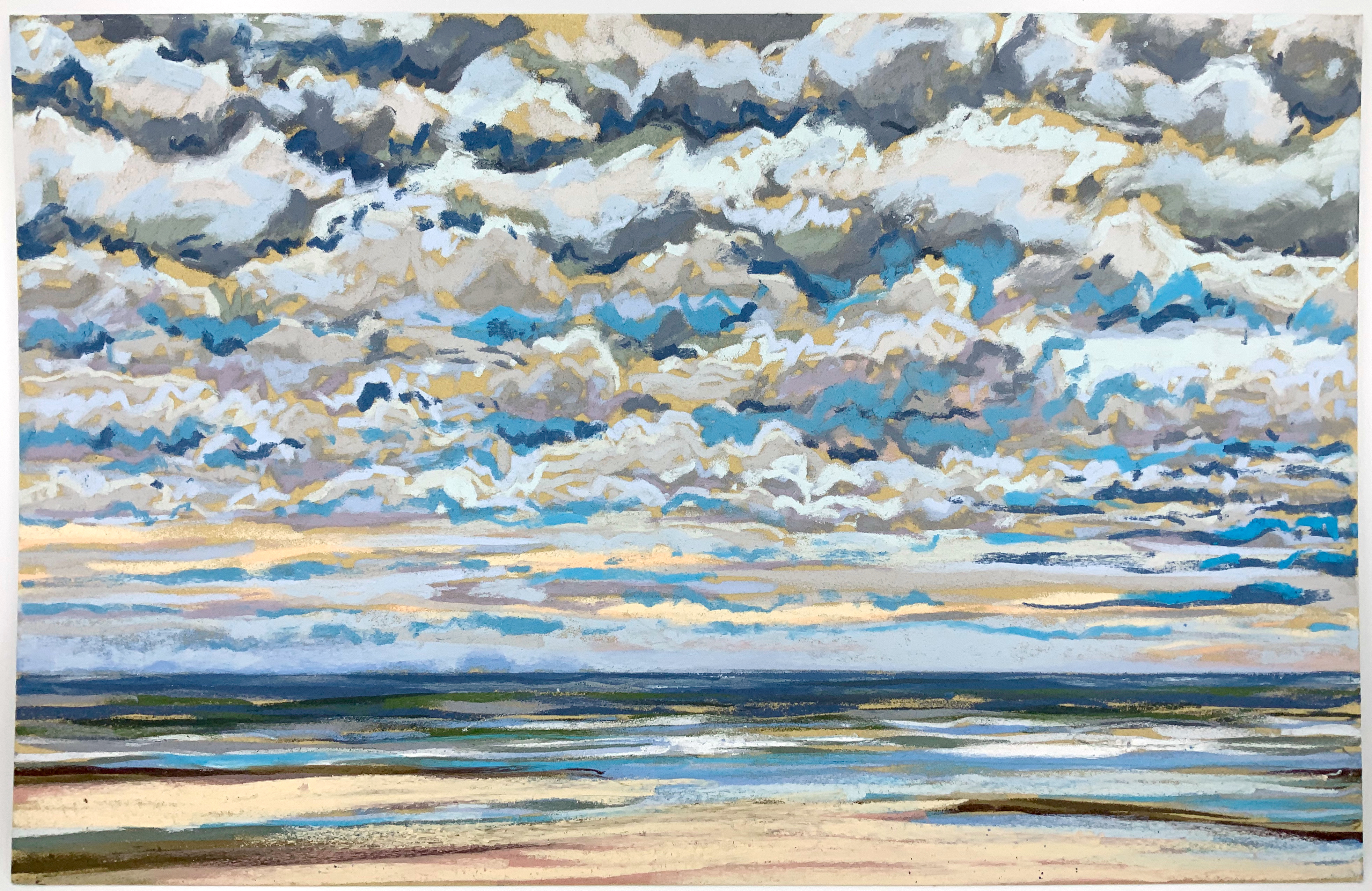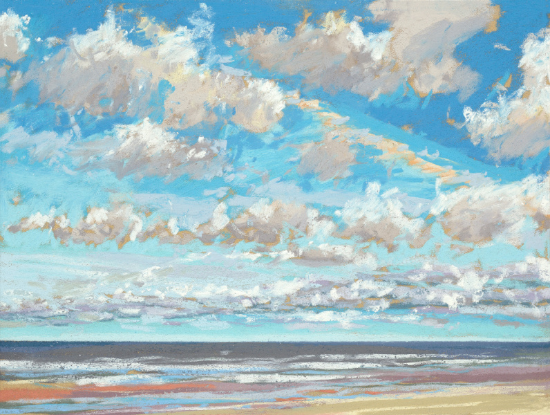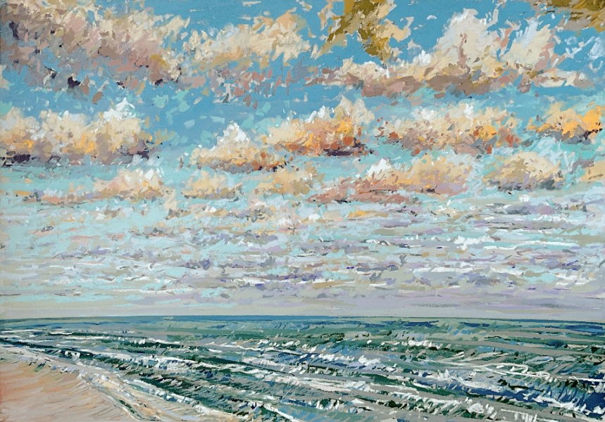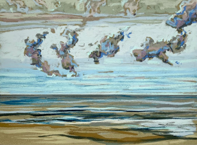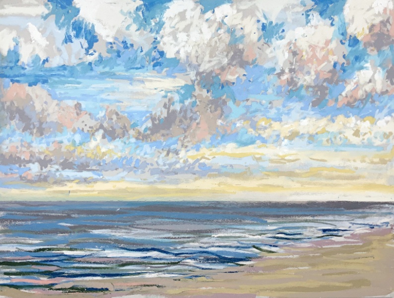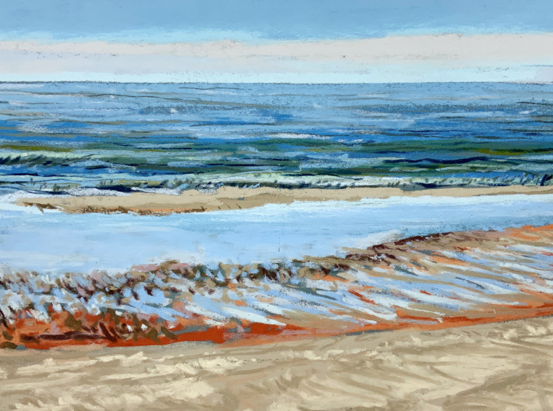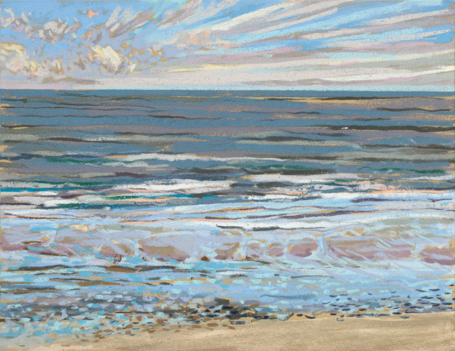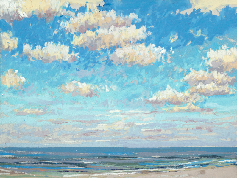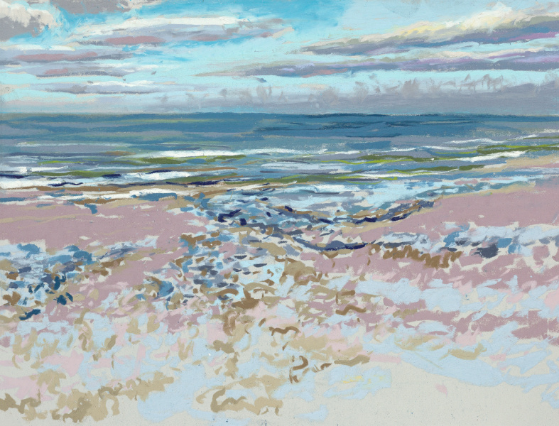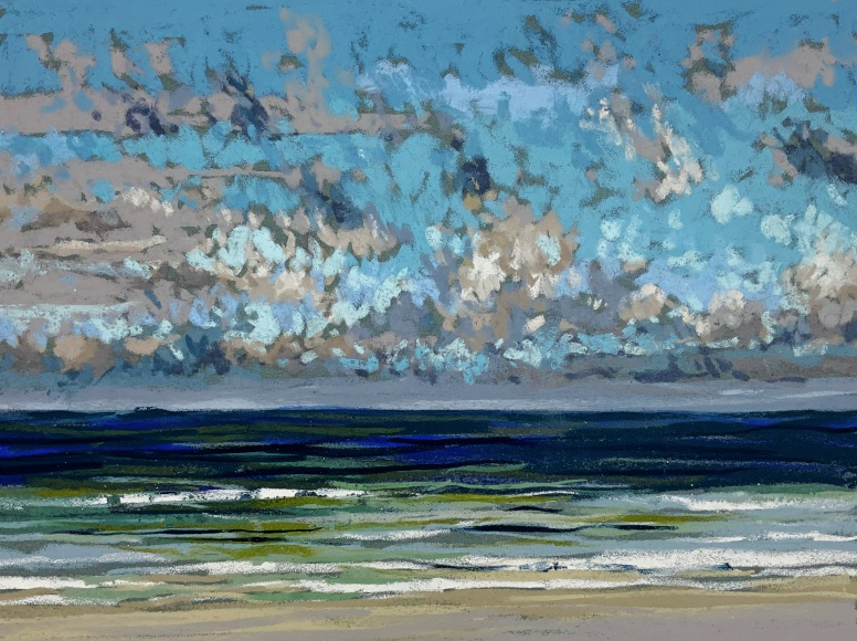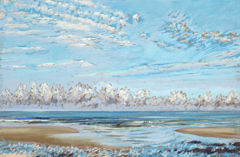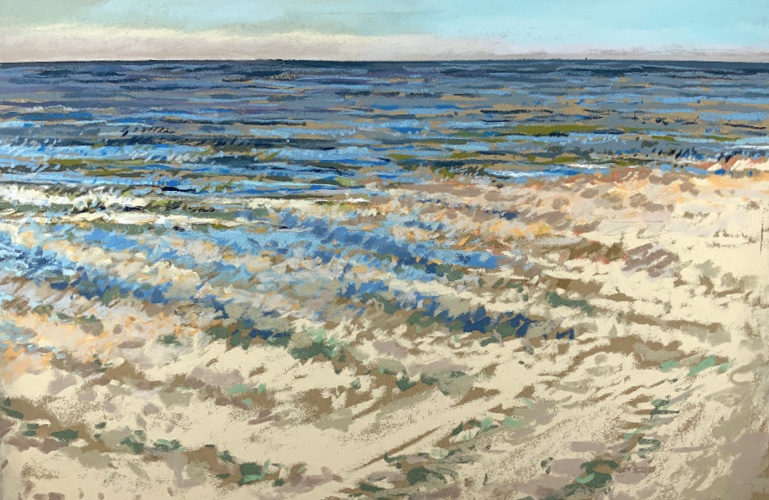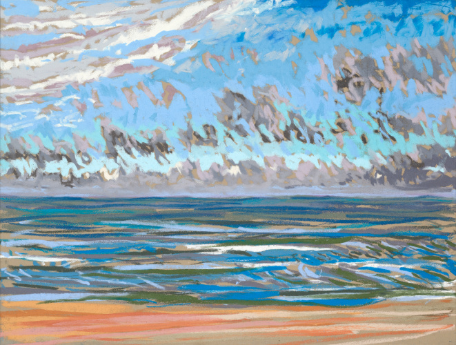 Sinds 2018 teken Van Meijel – zo vaak het kan – en plein air op het strand. Altijd met pastelkrijt en altijd op dezelfde plek: strandhuisje 3 bij de Texelse Beachclub.