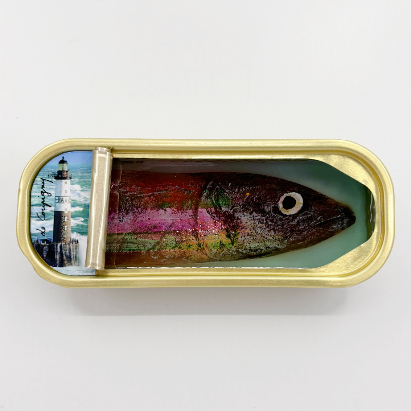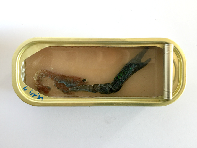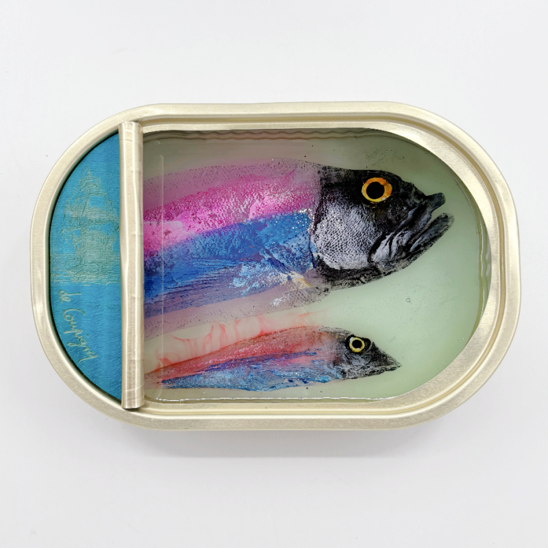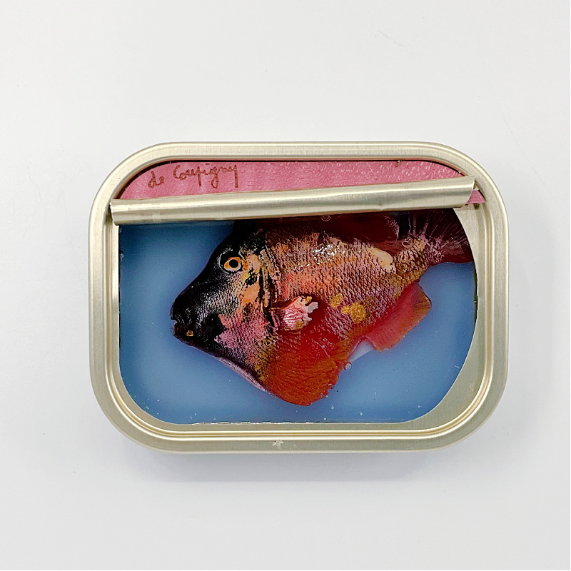 Ortaire de Coupigny werkt in Bretagne aan zijn humoristische oeuvre sardineblikjes. De vissen zijn gemaakt van was en worden beschilderd met verschillende materialen. Voor het zwart is bijvoorbeeld gebruik gemaakt van carbonpigmenten.